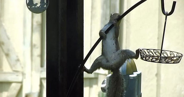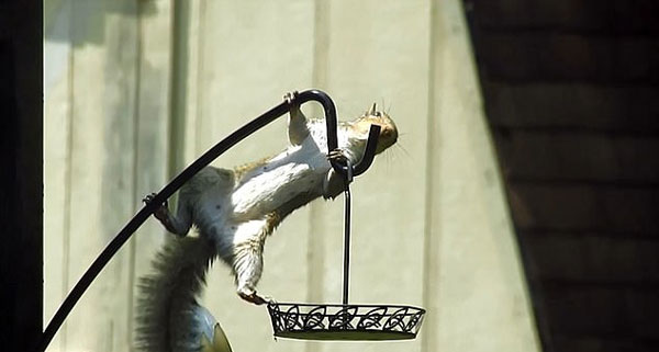 视频显示,这只灰色的松鼠孤注一掷地在涂满油的喂鸟器杆上不断地爬,决意要吃到喂鸟器上挂着的一盘种子。但是视频一开始,这个小家伙运气不好,它的爪子在涂满油的杆子上根本抓不稳,立马就滑回了起点。小家伙一只爪子紧紧地抓住喂食器的挂钩,以防自己掉下去,结果左右为难,两边都去不了,被挂在了中间。