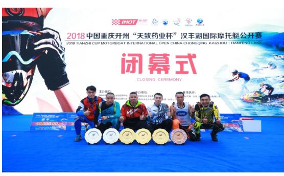 10月21号下午5点,颁奖仪式隆重举行。在国际组中,芬兰的Niko获得坐式水摩(RL3)竞速赛,。公开组中,深圳大鹏队的海金龙获得坐式水摩(RL3)竞速赛,;浙江队的Nobuki Nakagawa获得立式水摩(JO)竞速赛,;乐清水上运动协会队的胡创获得坐式水摩(RS1)竞速赛,;杭州弘健队的刘赫获得水上飞人(RF)花样赛,;深圳天荣队的吴昺辰获得中国方程式摩托艇竞速赛,;广西华信力队的刘益成获得坐式水摩(RL1)竞速赛,;坐式水摩GP竞速赛的竞争最为激烈,比赛最为精彩,最终由广西华信力队的余嘉获得,。