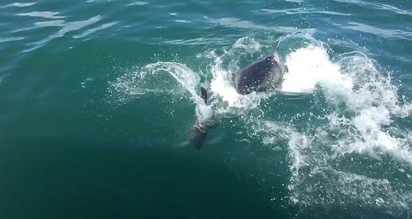 一名游客称,海豹经过他们的船时,遇到了一头10英尺(约3米)长的大白鲨。当时它们正互相追逐玩闹,当海豹跳起来的时候,几乎掠过鲨鱼锋利的牙齿,鲨鱼从水面跃起来,猛地咬了一下,水面上留下一道水波,而海豹迅速游到船底下,成功逃脱了死亡的魔爪。