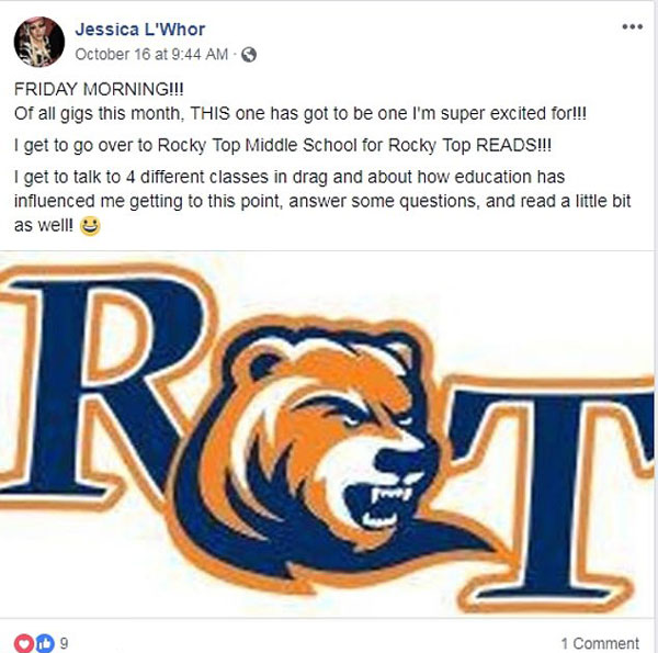 在洛基,中学职业介绍日举行的活动中,一位名叫杰西卡(Jessica L'Whor)的变装女王受邀与12岁的学生们进行交谈。她是一名男扮女装的男同性恋者,他讲述了自己的职业生涯,并和学生们探讨了校园欺凌行为。杰西卡认为这个话题引起了学生们的共鸣,几个学生表示:“我是一名同性恋者,在学校经常被欺负,我不知道该怎么办,但跟你的交流让我意识到自己仍然可以开心地做自己。”杰西卡告诉当地新闻媒体:“我得到的信息是,学生们愿意与我交流,他们在学校过得不好,我令他们再次感到快乐。”