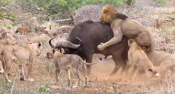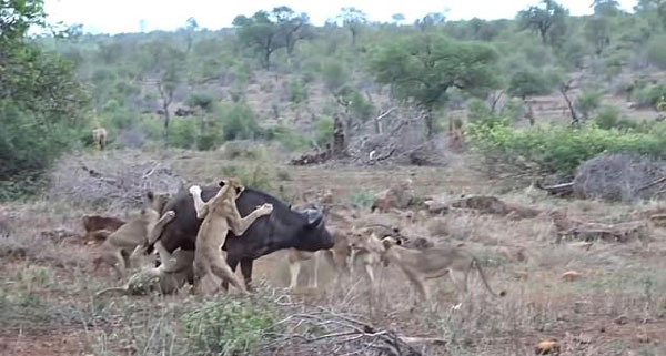 视频显示,有多达七头狮子同时围攻水牛,而水牛却形单影只,附近没有其他水牛来救它,只见狮子跳到了水牛的背上,而水牛也不甘示弱,与狮子搏斗了三分钟。但不幸的是,狮子无情地杀害了水牛。