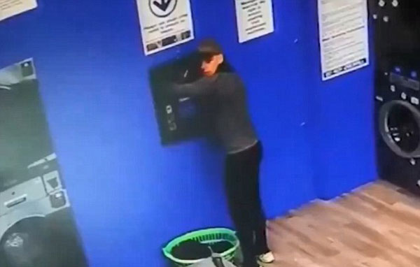 监控录像显示,该男子挥舞着斧头,铆足了力气砍向换零钱机器。在砍出了缺口之后,他将手伸进机器,拿出了成把的硬币扔到他的洗衣篮里。他看起来似乎并没有意识到自己正处于监控摄像头下。随后,这名男子驾驶着一辆蓝色小轿车离开了现场。