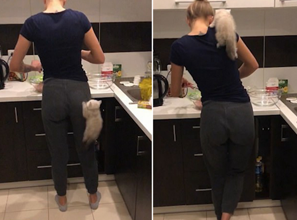 视频中的这名女主人在视频的末尾也咯咯地笑着,并微微弯下腰使小猫更容易攀爬上身。主人表示,小猫爬得非常快,每当主人做饭时,它都会这样做,就是为了得到一些好吃的食物。