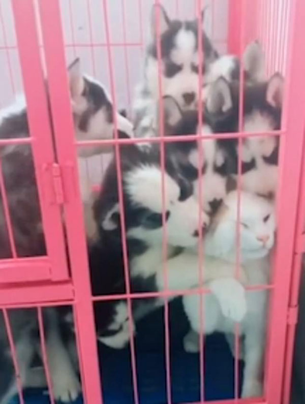 据悉,当时主人把猫咪和数只哈士奇幼崽放在了一起。刚进笼子没多久,这群幼崽就围了过来,它们互相推挤,上来就对猫咪一个劲儿地乱舔,猫咪想要逃离,无奈笼门紧闭。好不容易爬上了笼子,紧接着又被蜂拥而至的哈士奇幼崽给压了下去。视频的,,画面定格在猫咪被哈士奇幼崽挤在角落,一只爪子扒着笼子,一脸生无可恋。