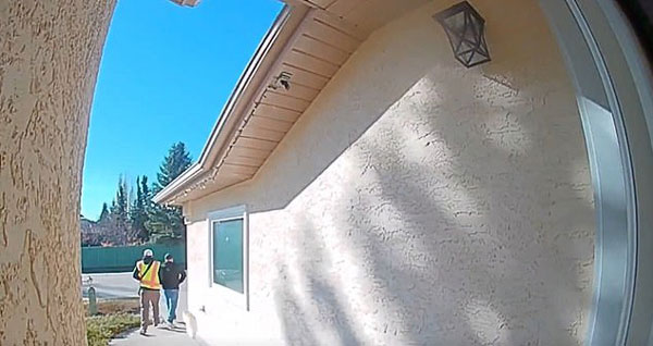 从克莱姆家的门铃摄像头录制的视频可以看到,其中一个小偷打扮成邮差的模样,正试图用螺丝刀撬开门。在他将门略微撬开时,克莱姆向他们大声喊话,将他们吓了个半死。随后,这对明显被吓懵的小偷快速从门口台阶离开。