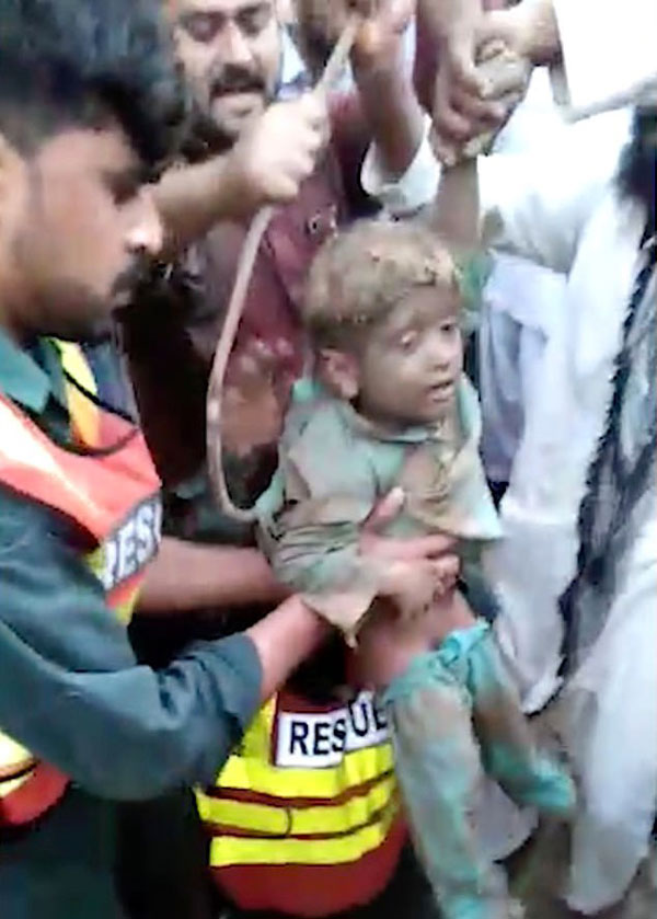 5日,在巴基斯坦旁遮普省萨西瓦尔的一个村庄,4岁的小男孩穆罕默德•阿德比(Muhammad Adeeb)正在追着球玩,却意外一头扎进了自家门外的露天深井里。当时同样4岁的堂兄乌萨马(Usama)正和他一起玩,看到这一幕,他立即跑去告诉他的家人。然而由于井口非常狭窄,直径只有10英寸(约25厘米),当地居民很难把他拉出来,于是他们叫来了救援队。但救援队花了4个小时才抵达。,,救援人员用塑料管和绳子把男孩拉了出来。