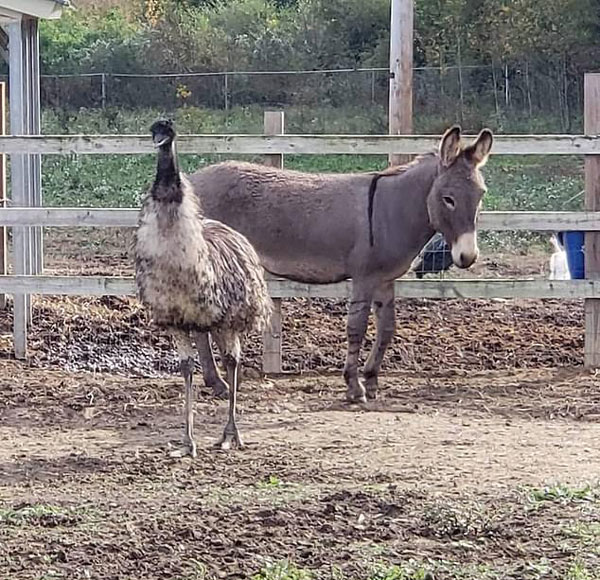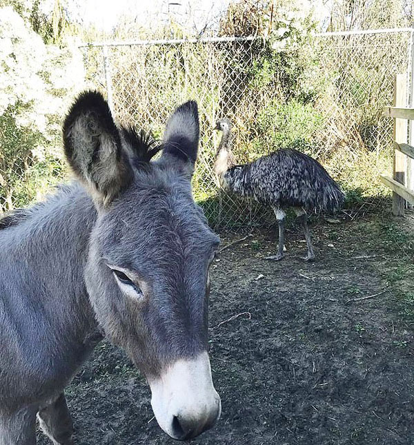 卡莱罗纳州水禽救援,的詹妮弗•戈登对《夏洛特观察家报》说:“它们喜欢依偎在一起,甚至睡在一起。”戈登说,当它们被分开时,驴会开始“大哭”,鸸鹋也会变得“疯狂”。该救援组织在脸书上写道:“我们今天才意识到,驴子和鸸鹋需要一起被领养。这两只不同外貌、不同背景甚至不同品种的动物学会了站在一起,互相保护,彼此相爱。”