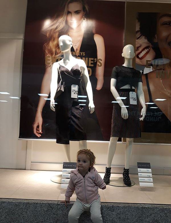 来自爱尔兰利默里克的尼娅•康汉(Niamh Counihan)和18个月大的女儿菲亚德(Fiadh)一起购物时,在当地彭尼斯商店的橱窗里看到了凯丽•诺克丝(Kelly Knox)的海报。34岁的凯丽在2008年摘得特殊模特选美大赛桂冠后一举成名,而小女孩菲亚德和她一样天生没有左臂。