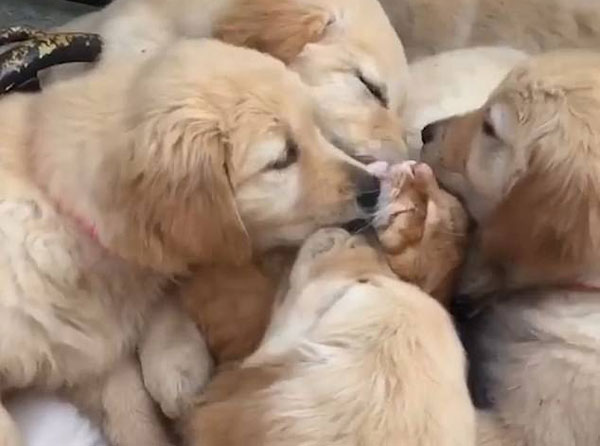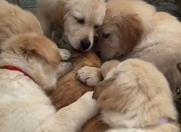【环球网综合报道】据英国《每日邮报》11月15日报道,在意大利亚历山德里亚市,有7只拉布拉多犬和一只可爱的姜黄色虎斑猫和交上了朋友。这只名叫朱塞佩的虎斑猫独自走在前面,后面跟着一群拉布拉多犬。当朱塞佩来到露台椅子上时,这群汪星人把它舔了个遍。不过它还是平静地坐着,看起来并没有受到汪星人们的干扰,继续享受着与汪星人们的新友谊。这一有爱的画面被拍下来上传到网上,引发网友围观。