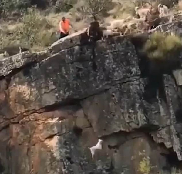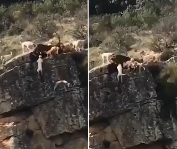 据悉,事情发生在埃雷鲁埃拉村庄附近。现场视频显示,当时悬崖边聚集着数十只猎犬,正在围攻一只鹿。一位目击者不断朝猎人喊道,“快跑!狗都掉下去了!”猎人出现后,目击者又提醒他,“已经有三只狗掉下去了!快跑啊!”但这名猎人却从容不迫地走到鹿的面前,亡羊补牢似的用刀捅死了这只鹿。与此同时,猎犬陆续坠落悬崖,落地时发出巨大声响。