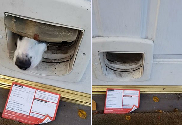 【环球网综合报道】据英国《每日邮报》11月20日报道,在英国肯特郡阿什福德镇发生了滑稽的一幕,一只狗狗拒绝接受邮递员斯科特•布鲁克斯塞进主人家门缝的包裹附单,将其从门下的猫洞里推了回去。斯科特拍下了这一画面,并将其发布到脸书上,配上了文字:“当你试图留下一张卡片,但小狗却不愿意!”