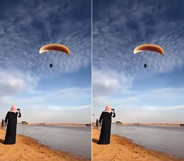 【环球网综合报道】据英国《每日邮报》11月22日报道,近日,沙特阿拉伯一名男子在驾驶动力滑翔伞降落地面时,径直撞上了沙滩上停着的一辆SUV和一名男子,造成该男子被撞进汽车底部,严重受伤,场景令人胆战心惊。