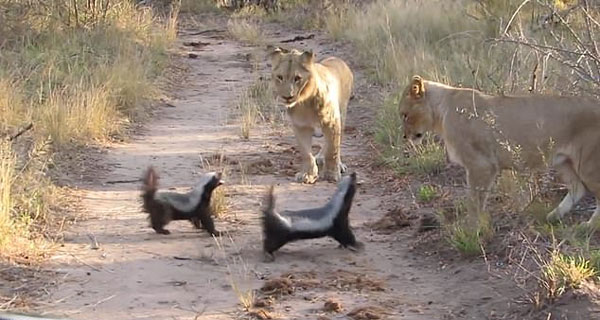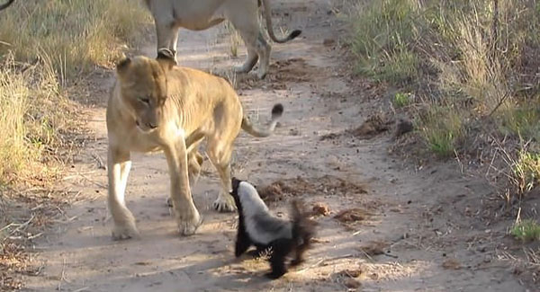 据悉,这对黑白相间的鼬鼠状哺乳动物不断向母狮摆出架势,发出嘶嘶声和标志性的“嘎嘎声”,然后跑进了灌木丛。然而不久一只勇敢的蜜獾又返回,不断地向一只母狮子冲去,尽管一只母狮子在多次后退之后试图靠近蜜獾,但它们的嘶嘶声和攻击声足以让狮子后退,在第二次对峙之后,它从一辆游猎车下冲了回去。蜜獾在不完全掉转背、不让自己放松的情况下逃离了这三只狮子。当蜜獾在草丛中奔跑时,两只母狮和一只雄狮缓缓地跟在后面,还能听到嘶嘶声。