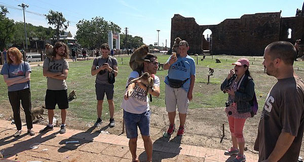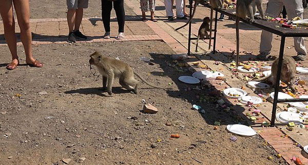 据悉,这段视频拍摄于泰国华富里市,正值当地的“猴子生日庆祝活动”。被猴子“攻击”的男孩名叫卢卡,来自意大利罗马市。视频画面显示,卢卡正在给他的爸爸拍照。这时,正在享受“水果自助餐”的猴群中蹿出了两只猴子,爬上了卢卡的肩膀。正当游客们聚集起来想要拍下这一幕时,其中大一点的猴子竟然爬上了卢卡的头,抢走了他的眼镜后逃之夭夭。由此,也引发了一场穿梭于灌木丛和车底的长达30分钟的追逐战。其中在卢卡背上的那只小一点的猴子还趁他不注意,从他的背包里拿走了一张明信片。