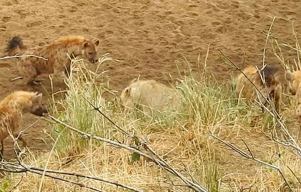 越来越多的鬣狗慢慢向狮子靠近,并发出号叫,仿佛战争的号角已响起。据安布尔•索姆斯(Amber Soames)描述,鬣狗一个接一个向狮子攻击。然而,狮子也丝毫不示弱,大有以一敌十二的英雄气概。战斗伊始,数百米外其它狮子应声而来,援助受困同伴。最终,鬣狗四散奔逃。