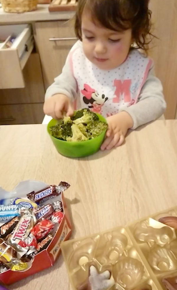 在这段由她父母拍摄的视频中,这个蹒跚学步的小女孩面前被逐一放上一瓶巧克力酱、一块巧克力、一盒贝壳形状的巧克力和一盒糖果,但马上逐一厌恶地推开它们,嘴里说着“不”。她环顾四周,好像在期待别的什么。,,她面前放了一碗西兰花,至此她终于开心起来了,脸上绽放出笑容,立即拿出一块放进嘴里并满足地吃了起来。