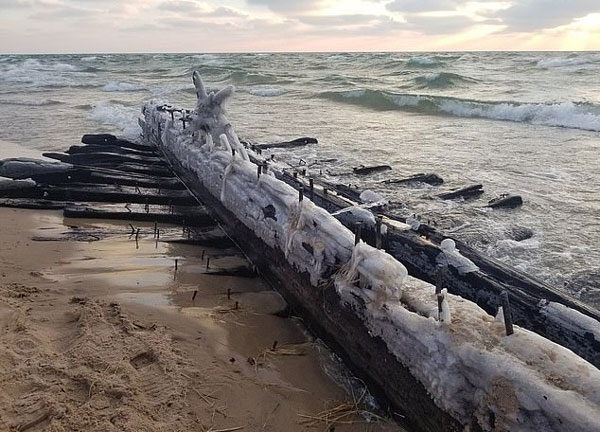 据悉,沉船遗骸出现在密歇根湖白河灯塔附近。从现场拍摄的照片中看,一艘巨大的木质帆船已残破不堪,部分船体上覆盖着些许冰块。目前,这艘沉船已吸引了附近许多居民前去观看,一些研究人员也正赶去,准备一探究竟。