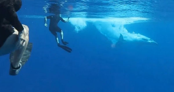她说:“我们与两头座头鲸一起和谐地游泳,小座头鲸忽然摇晃着身子朝水面游去。我们的向导喊道‘它要跃出水面了’!随后我们就目睹了这令人惊叹的一幕并为此震惊久久无法回神。它的母亲显然并不赞同这一举动,等它回落水中就将它领走了。它想保护它的孩子,对于这种疯狂且可能危及自身的举动并不高兴。”
