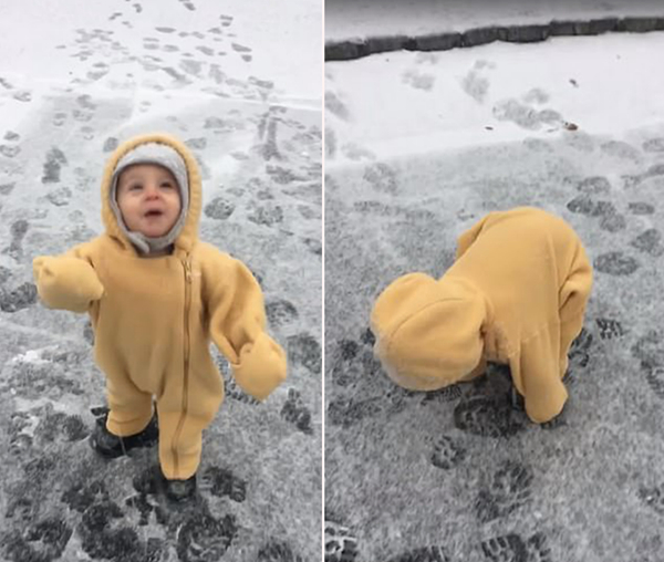 正在学步的乔赛亚穿着黄色连体服、黑色的靴子,带着银白相间的帽子,为冰雪大冒险做好了充分准备。视频中,小男孩在雪地中欢快地笑着。他仰望着天空,惊奇地张着嘴,看着雪花悠悠飘下来,有些还落在他小小的舌头上。