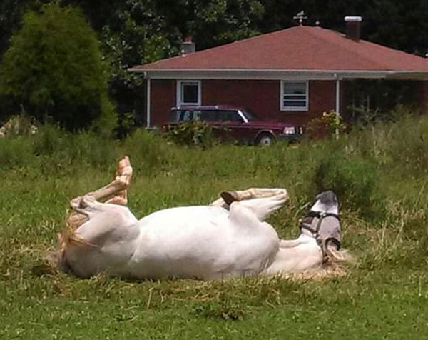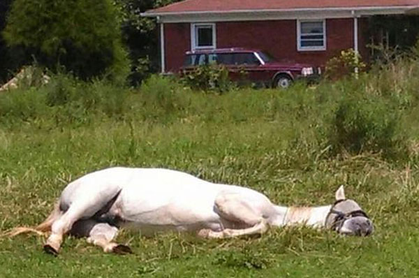这位推特用户还分享了探戈不是像大多数马一样站着睡觉,而是选择躺着睡觉的照片。她表示,这使得经过她家牧场附近的人怀疑它不是睡着而是死了。她写道:“探戈真的是这样躺着睡觉的,因为它懒得站着睡觉,所以人们整天都在敲门提醒我们。”其他照片显示,在下雨时,这匹马站在外面,而不是待在专门为它建造的畜棚里。