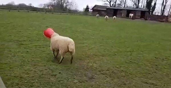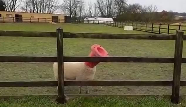 查理和家人住在贝德福德郡的沙恩布鲁克酒店,早晨起来他的儿子看到远处农场里有一只胖胖的绵羊慌乱地跑来跑去,起初他们以为这只羊被交通锥卡住了头,走近一看却发现那个“交通锥”原来是鸡饲槽。从视频中可以看到,有一只羊头上套着鸡饲槽在田野里乱跑,查理上前想将鸡饲槽拿下来,不想鸡饲槽坏了,只拿掉一半。其他的羊看到这一幕纷纷跑到母羊身边,想分得一点食物。