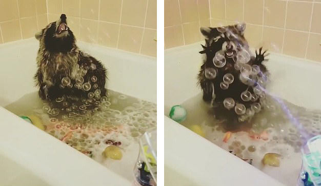 【环球网综合报道】据英国《每日邮报》1月10日报道,近日,一段拍自美国印第安纳州格林菲尔德的视频走红网络。画面显示,一只呆萌的小浣熊正在一边洗澡一边玩着泡泡枪,不禁让人感叹这大概就是理想中的沐浴时光。