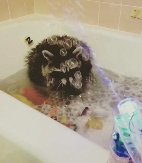 这世上没有什么比洗澡玩泡泡更有意思的事情了,这只名叫雷吉(Reggie)的浣熊十分理解这种感受。从视频中可以看到,它站在一个漂浮着沐浴玩具的浴缸里,在它的面前泡泡枪正疯狂地向它喷射着泡泡。小浣熊立即被这些缤纷的泡泡吸引住了,它的头跟着泡泡飞的方向不停转动,还伸出可爱的小爪子去捉泡泡,想要把它们放进浴缸里。