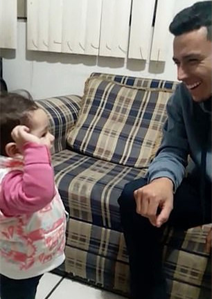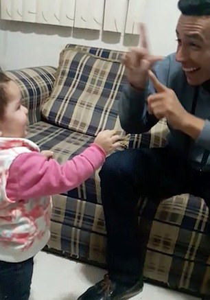 在该视频中,她拍了拍父亲的手,然后将手指放到她的嘴边,意思是:“面包!”她的父亲被逗笑了,用手语回复她:“你是想用手语吗?”