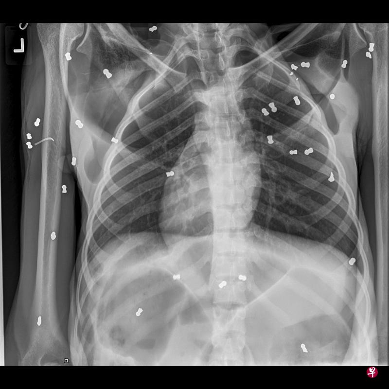 图说:X光片显示雌猩猩体内共有74颗铅弹