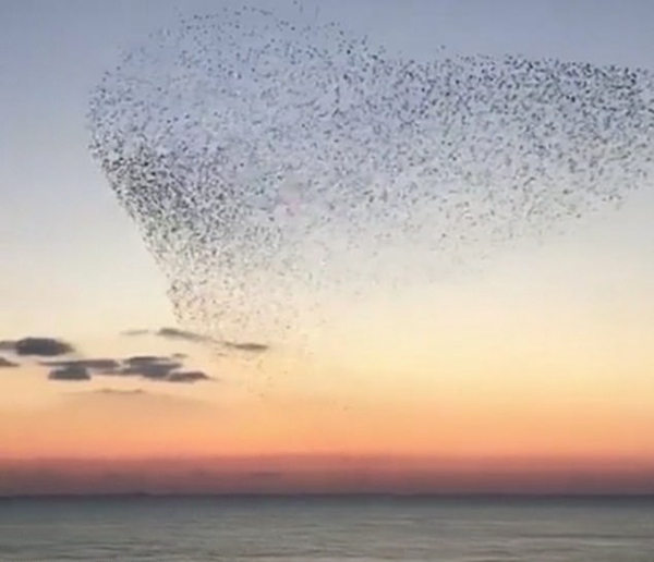 视频中,这群椋鸟在蓝色的海面上翩翩起舞,在天空中变换各种各样的惊人图案,当它们齐声俯冲时,在美丽的夕阳下跳出绝美的舞蹈,向游客们展示了令人震撼的空中表演。
