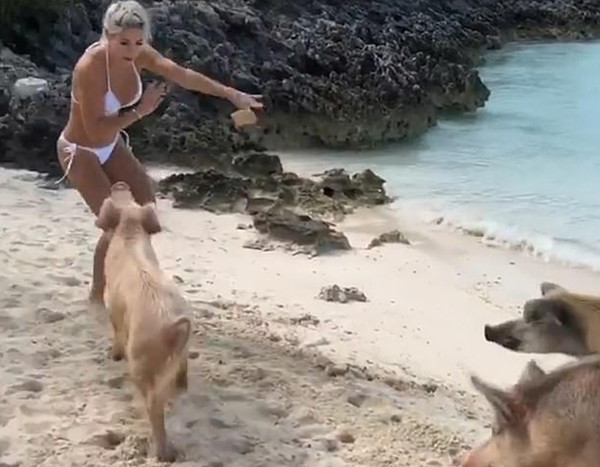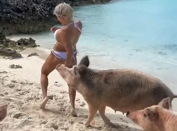 【环球网综合报道】据英国《每日邮报》2月12日报道,委内瑞拉健身模特米歇尔•卢因(Michelle Lewin)在巴哈马群岛度假时,在海滩上被4头不安分的猪追赶,其中一头甚至咬了她的臀部。