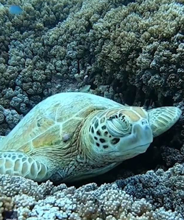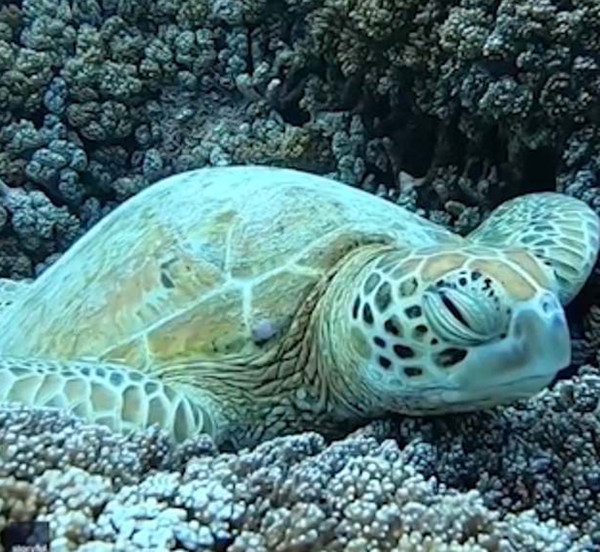 【环球网综合报道】据英国《每日邮报》报道,海洋生物学家杰西塔•沙克尔顿(Jacinta Shackleton)在澳大利亚大堡礁录制了一段视频,记录了一只绿色海龟在珊瑚群中打盹时的样子。视频中的海龟轻轻地闭上眼睛,在水中闭目养神,其他小鱼在它周围游动,景象十分优美。