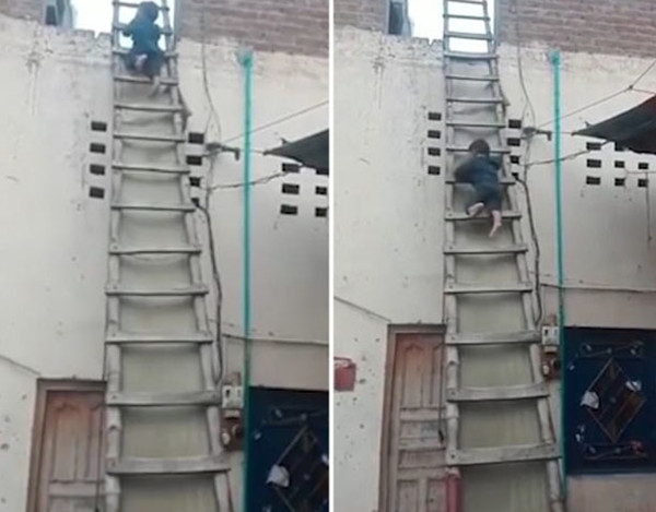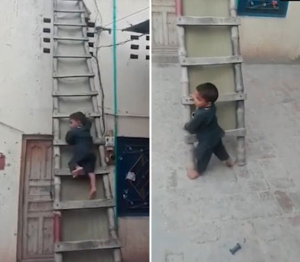【环球网综合报道】据英国《每日邮报》报道,在巴基斯坦的萨戈达,一名3岁男孩在试图从一座建筑的阳台上下来时,选择顺着搭在墙上的12英尺(约3.7米)高的梯子上滑了下来,并安全到达地面,所幸没有受伤。