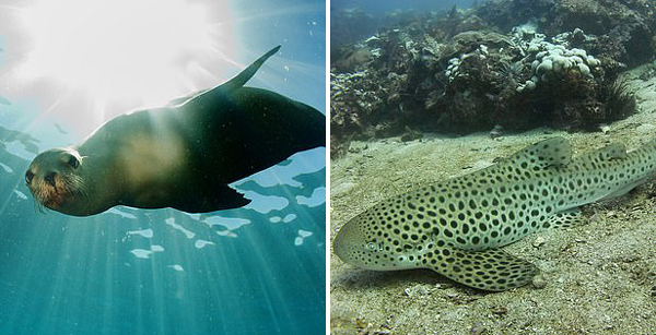 海狮(左)以捕食较小的鲨鱼而闻名,包括豹鲨(右)和长尾鲨