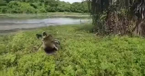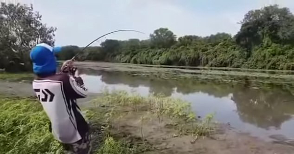 该渔民名叫丹尼尔,当他的钓线突然绷紧的时候,他的朋友在后面大喊大叫“丹尼尔,加油,拉紧鱼竿!”丹尼尔费力地往岸上拖上钩的大鱼,但他们钓到的澳大利亚肺鱼却吸引来了一只鳄鱼,他们兴奋的心情迅速地转变成恐惧。丹尼尔的朋友吓坏了,尖叫着“跑回来,兄弟!丹尼尔快跑!”他们全速冲过泥巴地,鳄鱼却紧跟在后面。不过,在鳄鱼咬到他们钓到的大鱼,停下来大快朵颐时,两人也停了下来观察。