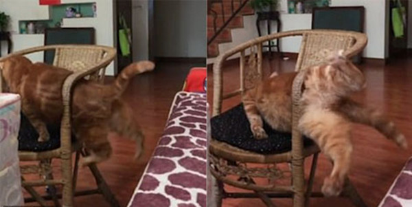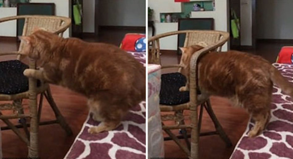 开头很轻松,直到半路被卡住,它的两条后腿晃来晃去,悬在空中。它拼命地用前爪抓着椅子,想把自己撑过去。为了避免完全从椅子上摔下来,它笔直地伸出自己的后腿。在漫长的挣扎中,几经“辗转”,它才奇迹般地钻过去了。这只意志坚定的猫的辛勤付出有了回报,最终悠哉地坐在了椅子上。(