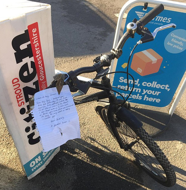 这个小偷为了避开徒步走3英里(约4.83公里)的路程,从斯特劳德(Stroud)的一家商店外偷走了一把未上锁的自行车。第二天,这辆自行车被送回了同一地点,手柄处还有一张便条。便条原文如下: