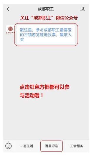 本次评选,以成都市总工会官方微信公众号“成都职工”为载体进行投票评选,活动已于4月11日正式启动。通过为期半月的线上投票,将最终评选出“成都职工最喜爱的古镇游览胜地”10强,同时将向职工评选第一名的古镇授予“成都职工最喜欢的古镇游览胜地”标牌。