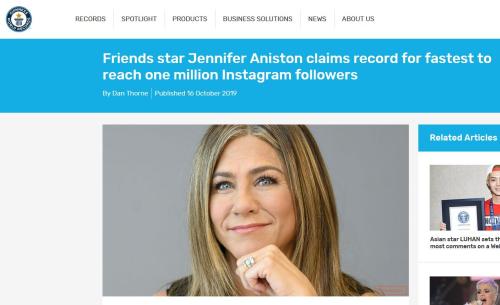 詹妮弗在短短5小时16分钟内,就累积了100万名关注者,打破了英国哈里王子和妻子梅根在今年4月,以5小时45分钟累积100万名关注者而创下的吉尼斯纪录。