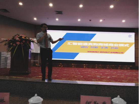 汇能科技福建分公司副总裁赖强林介绍宾购商城的商业模式,详细解读了商家、店长、消费者三种身份的群体在宾购商城的入驻条件和收益。