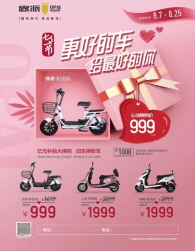 同时,为了回馈消费者,欧派电动车还推出了一系列促销活动。例如从七夕节开始的欧派电动车亿元补贴大换购活动,旧电动车、摩托车补贴折价,抵1000元,而部分活动车款例如“欧派-佩奇”正是今年7月中旬才推出的新款式。而七夕节活动结束之后,欧派电动车的开学季活动也将马不停蹄地赶来,这一系列举措和活动力度足见欧派电动车对消费者的诚意。