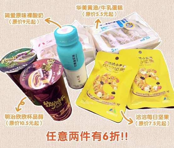 在深圳711任意门店购买以下四种材料:简爱原味裸酸奶、华美黄油/牛乳蛋糕、明治欣欣杯品醇和恰恰每日坚果,任意两件搭配即可享受“任意搭随心配”的6折活动,原价32.5元起秒变19.5元。
