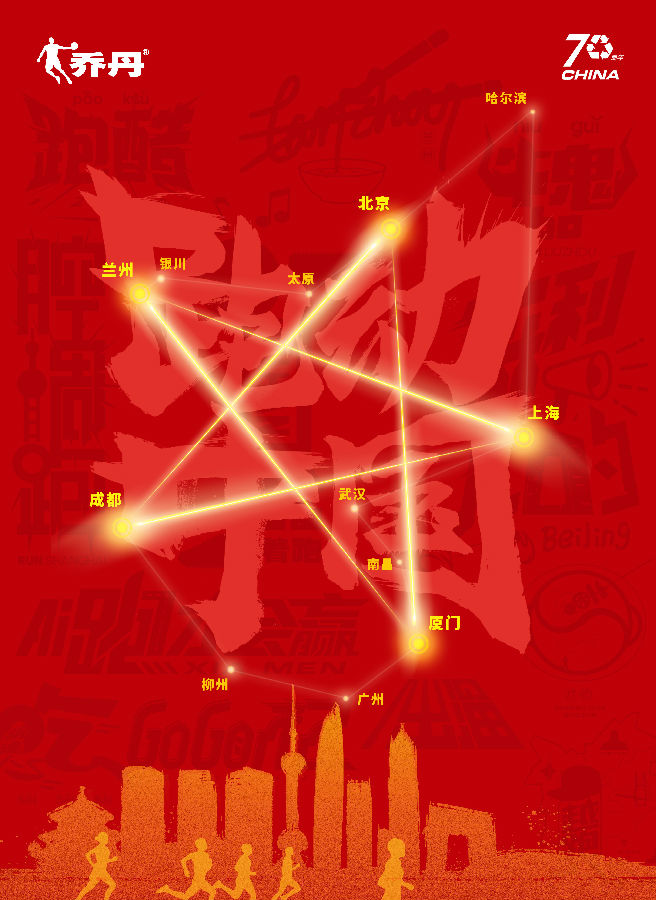乔丹体育2019#跑动中国#城市主题跑以兰州作为,站启动以来,历经3个月跨越5座城,先后经过北京、成都、上海,,到达厦门,每城7公里,在地图上连线跑出五星,焦安静、孙英杰、史冬鹏、林俊泓等,运动员纷纷加入其中将中国不同城市间的文化精神进行传承和接力!除了5站的线下城市主题跑活动外,同时在线上开展了乔丹体育2019#跑动中国#线上城市PK赛。跑者可以选择自己喜欢的城市加入城市战队,进行跑量PK。活动为期4个月,据悦跑圈公布数字显示:超过55万跑者参加,跑步总里程高达700万公里,连起来可绕中国版图126圈。12城市相互PK跑量共同传递城市文化传播环保精神,献礼建国70周年!