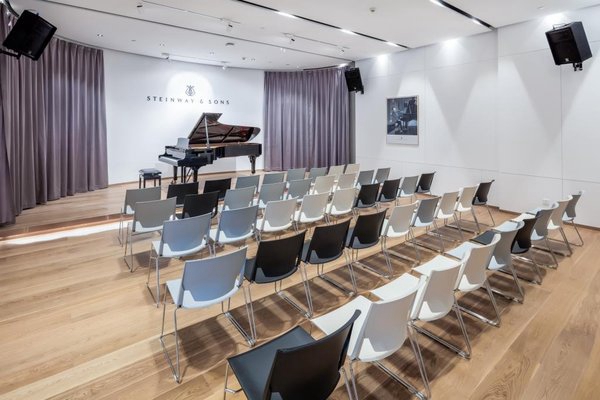 其建筑设计,匠心,尽显施坦威的优雅格调,透过明亮的临街落地窗可以一览其间典雅的艺术世界。其占地近400平方米,不仅是一家零售店,展示和销售施坦威钢琴及其家族系列钢琴,包括波士顿钢琴、郎朗钢琴、艾塞克斯钢琴;而且还拥有一个能容纳五十名观众的霍洛维茨音乐厅,可以供艺术家、音乐家、音乐教育工作者等举办各类音乐会和大师班。在灯光璀璨的演奏厅内,古朴的木质地板上整齐地摆放着相间交错的黑白座椅,犹如黑白琴键般奏出跳动的音符,与明丽的舞台相得益彰。