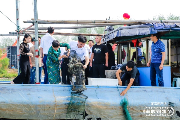 上午9时30分,中共淮安市洪泽区委常委、宣传部长花群;江苏省商务厅电子商务和信息化处副处长邢冲;阿里巴巴集团战略发展部总监薛德恩等相关领导,齐聚开幕仪式现场,多方共同携手鸣响开捕的锣声,宣告着洪泽湖大闸蟹的正式开湖。
