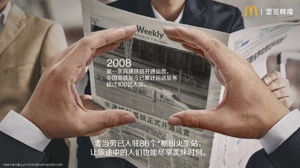 4.便捷出行,美味随心:2008年,,条高速铁路--京津城际铁路正式开通。高铁不仅改变了人们的出行方式,更推动了区域经济发展。麦当劳已入驻86个枢纽火车站,为旅客提供便捷美味。