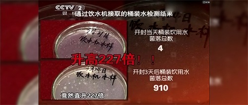 如果您很幸运到正规渠道买到了合格的桶装水,如果使用不当仍存在多重安全隐患。据CCTV-2央视财经《是真的吗》栏目曝光,经国家计量资质认证的检测机构检测数据显示,生产合格的桶装水开封后3天的菌落总数是开封当天的菌落总数的227倍,超过国家标准8倍。菌落总数超标的水可能会导致人体免疫力下降,特别是对易感人群, 如老人、小孩等, 甚至会出现肠胃不适, 呕吐腹泻等症状, 危害人体健康。