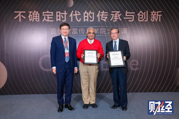 唐宁(左)为拉姆-查兰(中)及屠光绍(右)颁发宜信财富传承学院大师证书