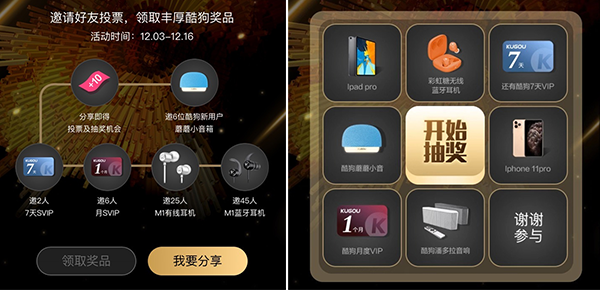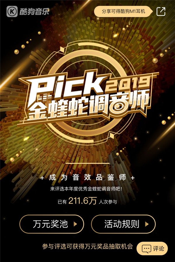 金蝰蛇调音师大赛评选仍在继续中,12月3日至12月16日 24:00,大家可以登录酷狗音乐APP,搜索“金蝰蛇”,点击专题即可参与大赛投票,更有机会抽取iphone 11 pro等丰厚奖品。邀请好友一起为喜欢的音效进行投票,还可领取额外奖品。