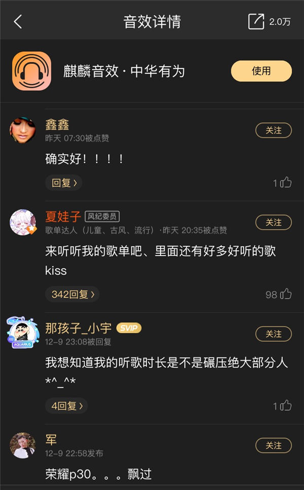 酷狗独有的调音师开放生态,让许多热爱音效的用户可以创作音效并上架酷狗音效,极大丰富了蝰蛇音效。2019年6月6日,调音师“薇伶”上线、名为“麒麟音效·中华有为”的手机音效,以支持民族品牌与自主创新。这款高品质音效专为华为海思麒麟SoC专属适配优化,可以智能美化高频、低音、人声等各频段音色并维护多维流动声场。该款音效一经推出,便深受网友喜爱,音效评论区也获得了大量用户的认可与赞同。目前,麒麟音效使用人数已达950.7万人。而,上架的另、用户UGC音效FreeBuds 3立体均衡音效,可自适配华为手机,在重低音声场优化、自动降噪等方面表现也极为优秀。